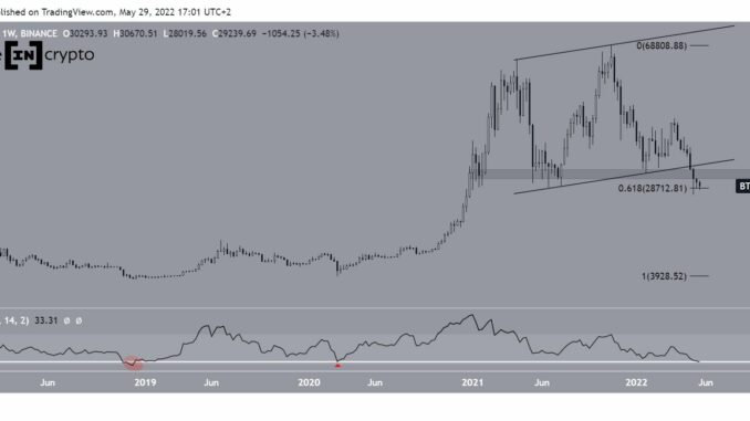 Currently, the price is trading just above $28,700, which is the 0.618 Fib retracement support level. While this is considered a crucial Fib support level, BTC has fallen below the horizontal support of $30,000. As a result, there is no more horizontal support left until below $20,000.