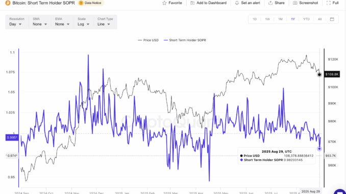 The Spent Output Profit Ratio (SOPR) measures whether coins moved on-chain were sold at a profit or loss. For short-term holders—who are usually the most reactive—the metric provides a near-real-time gauge of sentiment.